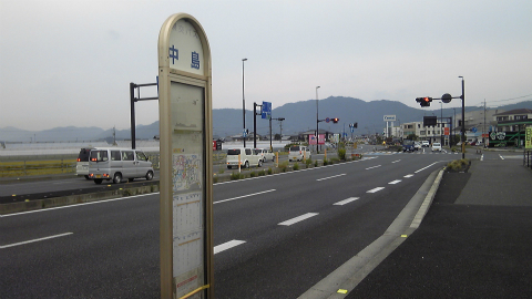 仁淀川大橋を渡って、中島バス停で下りる。このバス停、高岡方面行と宇佐方面行ではバス停が違うようなので注意する必要がある。前日の高岡方面行きは国道沿いにあるのに、宇佐方面行きは側道に入ったところにバス停があるのだ。
