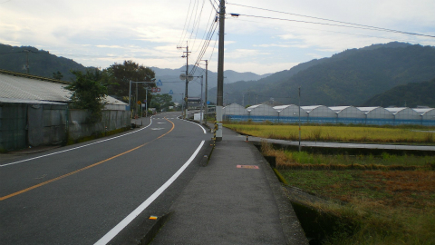 はじめは道の左右の山はかなり後方にあり、川沿いの土地はかなり広くビニールハウスなども見えたのだけれど、それが少しずつ狭くなる。山が迫ってくるからである。露地の畑に植わっているのは生姜だろうか。かなり大規模に作られている。看板があって「宇佐ショッピングセンター 次の信号右」と書いてある。宇佐だから、トンネルをくぐって5km近く先のはずである。そこまで信号がないのかなと思った。