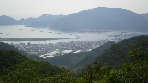 塚地峠から3分ほど登ると、地元有志の方の手作り休憩所がある。宇佐湾が望めるすばらしい景色である。小さく見える宇佐大橋、渡るとかなり海面から高い。