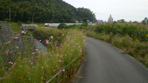 コスモスの濃いピンク薄いピンク、他にも橙色の花が咲いているのは、刈り入れが終わってから種を蒔いたのだろうか。私が子供の頃、社会科の授業で高知は二毛作ができると習った。温暖な気候を生かして、春から夏に1回目と夏から秋に2回目、年2回米を収穫できたのである。その後すぐに減反政策が始まってしまったが、早くに刈り入れを終えてコスモスを植えるのだろう。