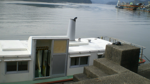 さて、この武市水産。建物の前が広くなっていてそこで作業をしていたところからすると、土地は武市水産のものなのだろう。作業の邪魔をしないように通り過ぎると、コンクリの岸壁に巡航船が接岸されていて、その前が待合所になっている。待合所はあるのだが、トイレとか水道、自販機はない。船の中にもトイレはないようだったが、差し迫った人はどうするのだろう。