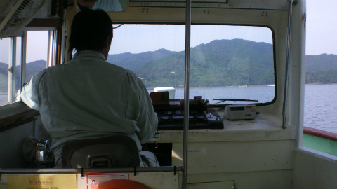 時間ちょうどに、船長さんがやってきて乗船。行先を聞かれて運賃を払う。操舵するのも客の相手も全部ひとりでやるワンマン船なので(待合所にも誰もいない)、大変忙しそうである。横浪まで、松ヶ崎、下中山、深浦、塩間、長崎、今川内、福良、須ノ浦と8つの乗船場があるのだが、沖合から見て誰も待っていないと岸に付けないでそのまま次に向かう。地元の人で慣れていないと、途中から乗るのはなかなか大変である。