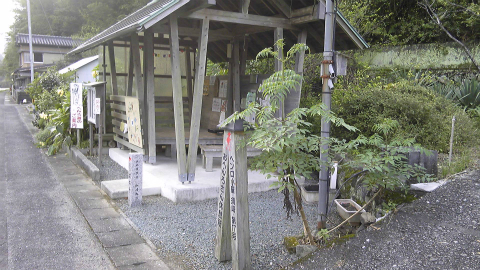 塚地峠休憩所。ここで国道と遍路道が分かれる。トイレ・自販機あり。ただし湧水は保健所の指導により飲めない。