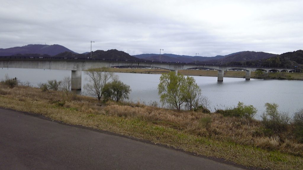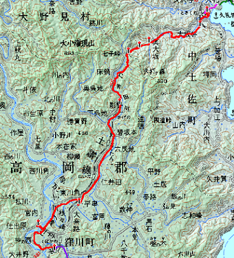 しばらく進むと、集落の真ん中に空高く橋脚が立ち上がり、その上を高速道路が通っている。近くまで行くと橋脚に、「この橋は四国で一番高い橋です」と書いてある。ビル10階分では足りないくらいの高さで、よくあんな空中に作ったものである。その高速道路とは別に、山の中腹を迂回しつつ国道が左上にずっと登り勾配で続いている。