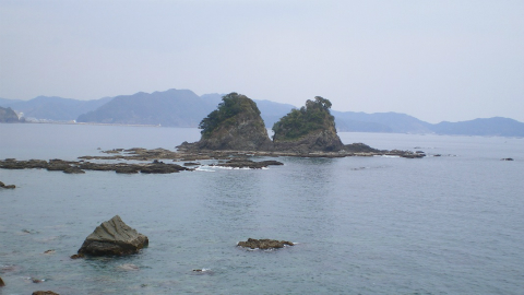 この建物から先には道路に電柱も登場して、ようやく人里が近づいた気がした。やがて、久礼のランドマークである双名島が見えてくる。この島、方向によっては地続きに1つの島があるだけに見えるが、近くまで行くと岬から直線上に2つの島があることが分かる。久礼湾が荒れることを不憫に思った鬼が、串に刺して岩を持ってきたという言い伝えがあるらしい。