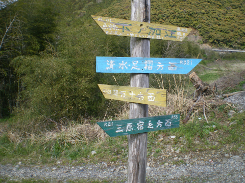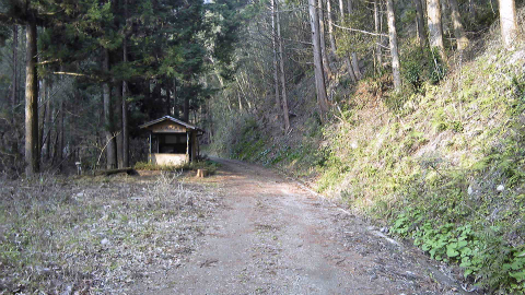 さて、最後の民家を過ぎても三相三線2組の電線は続いていたのだが、高速道路橋の方向に分かれて行き、電柱も何もない登山道になった。心配していた登山道の補修は終わったようで、通行止めの注意書きもないし迂回の指示もない。しばらく前から砂利道だ。最後の民家から15分ほど歩いたところの川沿いに休憩小屋が現われた。