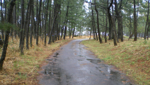 しばらく平和な田舎道が続く。ところが5分ほど歩くと道は登り坂となり、林の中に入って行く。左側は川に向かって斜面となっており「ゴミ捨て禁止」の立札が何回か現れる。こうした立札は人通りのない道によく立てられているので、ちょっと心配だ。そういえば道の駅からこちら、誰ともすれ違わない。