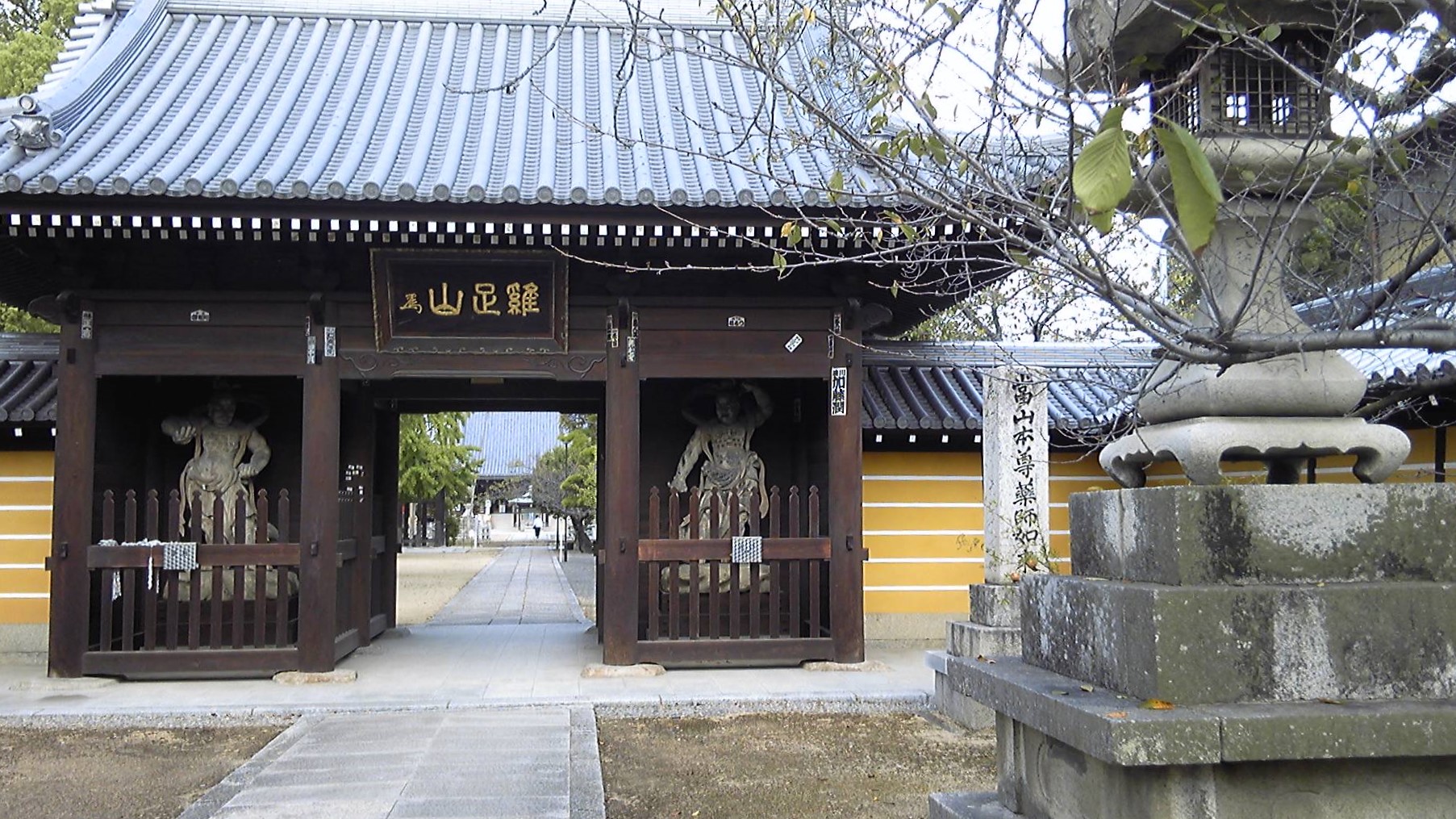 その鳥居は金倉寺とは別の新興宗教の神社のようだったが、その奥が金倉寺の駐車場だった。いったんぐるっと回り込んで、仁王門から入る。「鶏足山」の扁額がよく目立ち、その先に参道が伸びている。