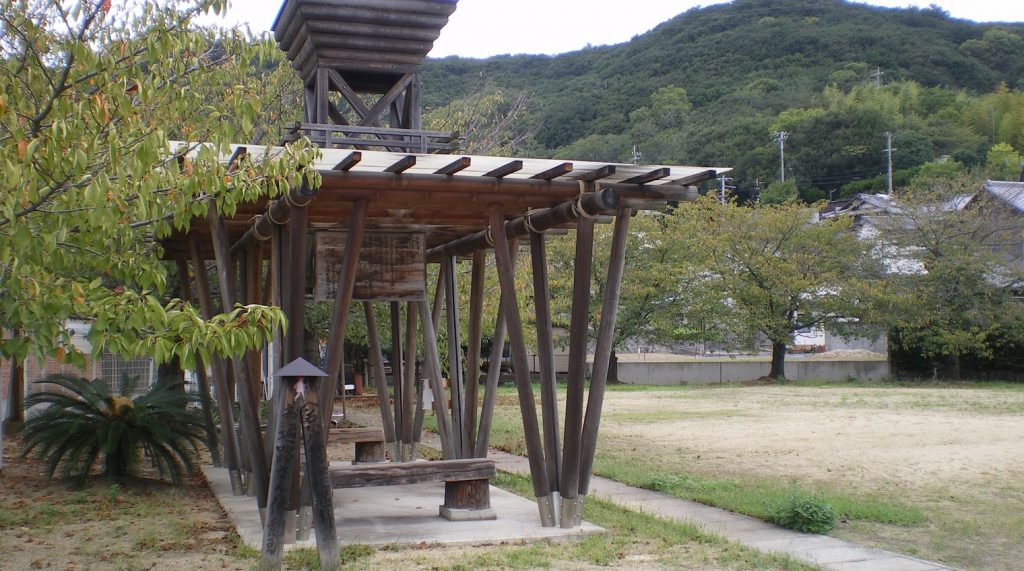歩き始めて1時間半。さすがに疲れてきた。金倉寺からここまで、休憩所もなければベンチの一つすらなく、コンビニにイートインコーナーもなかった。ちょっと座って休めたらいいのにと思っていたら、目の前の高台に東屋のようなものが建っていて、中にはベンチが見える。近くまで行くと幟が立てられていて、中にはポスターが貼ってある。
