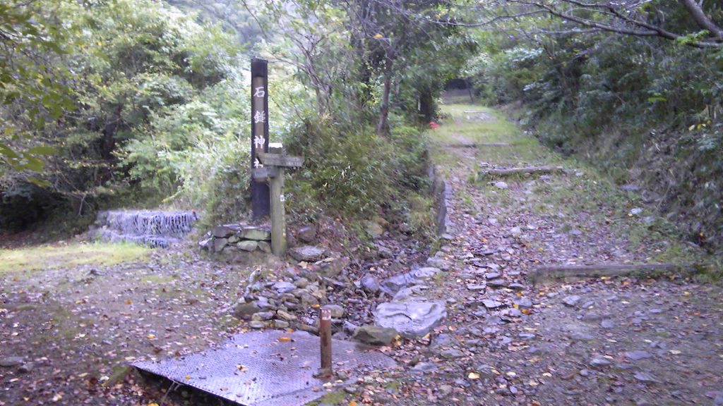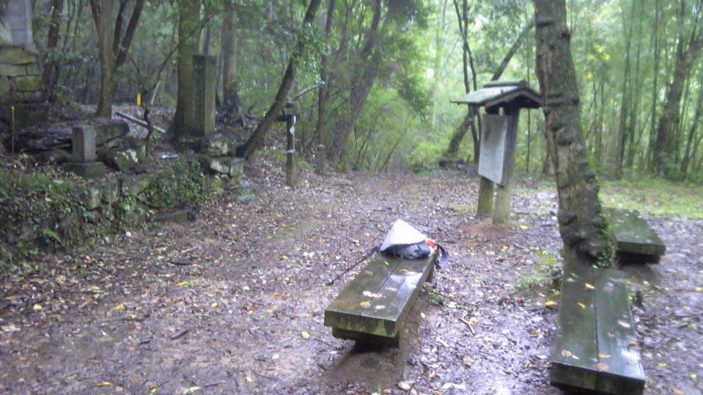 1時間20分歩いて、何とか十九丁に達する。しかし、ここには祠とベンチがあるだけで、東屋もなければトイレもなかった。ベンチはもちろんずぶ濡れで、そのまま座ることはできない。