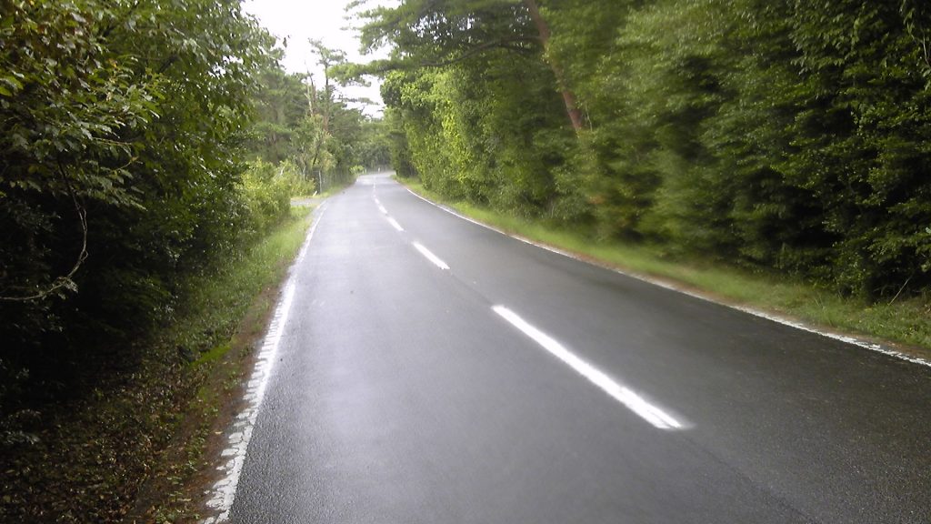 しばらくは緩やかな坂道が続いて何ということもなかったが、10分も進まないうちに空が再び暗くなり、バケツをひっくり返したような土砂降りとなった。レインウェアを着るんだったと思ったところで後の祭りである。もちろん、東屋もベンチもない。