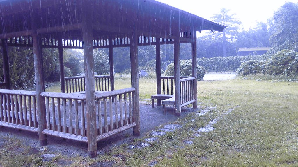 舗装道路に出てまもなく、左手に東屋が見えた。ようやく、ちゃんと休める休憩所だ。屋根の下まで行き、傘を置き、リュックを下ろす。
