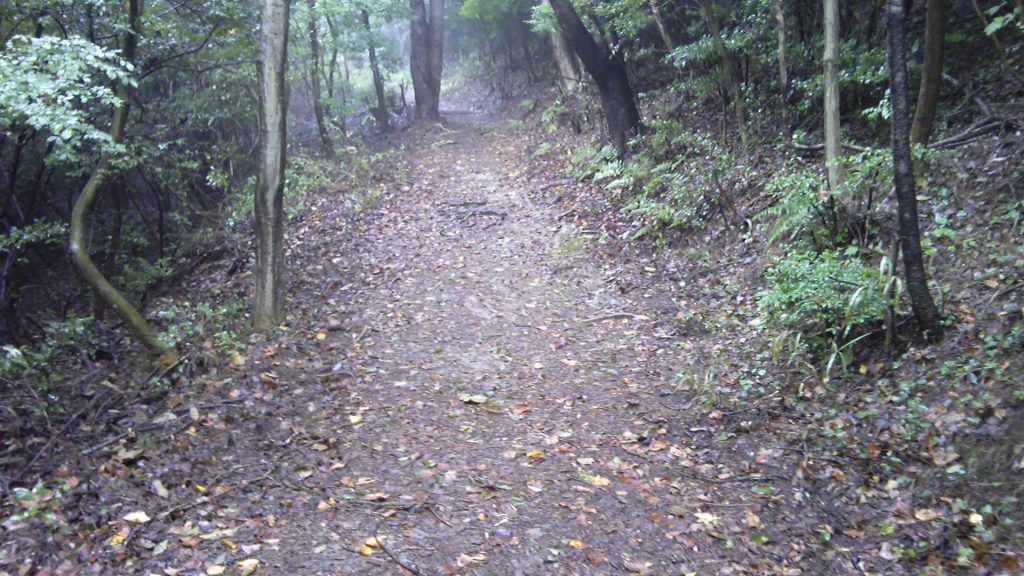しかし、ゆるやかだったのは最初だけで、ほどなく岩がごつごつした坂道となった。やっぱり、舗装道路を行くんだったと思ったけれど、後の祭りである。十九丁あたりを歩いていた時より雨が弱くなってきたのが救いであった。