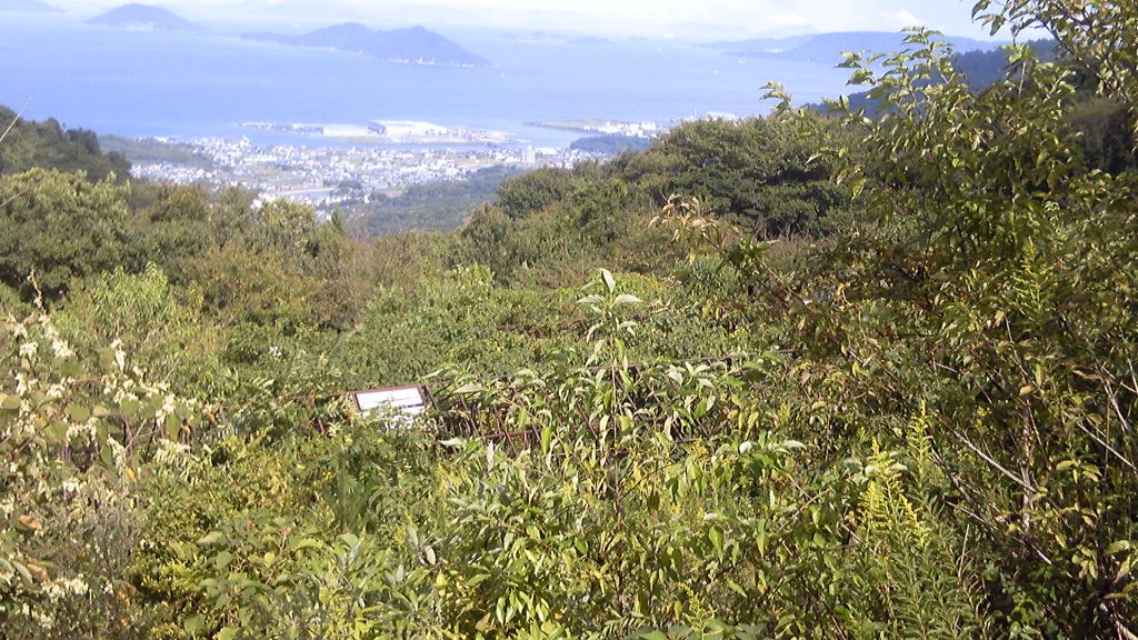遍路道との分岐を通過し、鬼無(きなし)への下り口に着く頃には、朝から鬱陶しく広がっていた雨雲が抜け、青空が見え始めた。そして、すぐ足元には瀬戸内海。高松は宇高連絡船が通っていたように海沿いの街だから、五色台のすぐ先は瀬戸内海なのである。