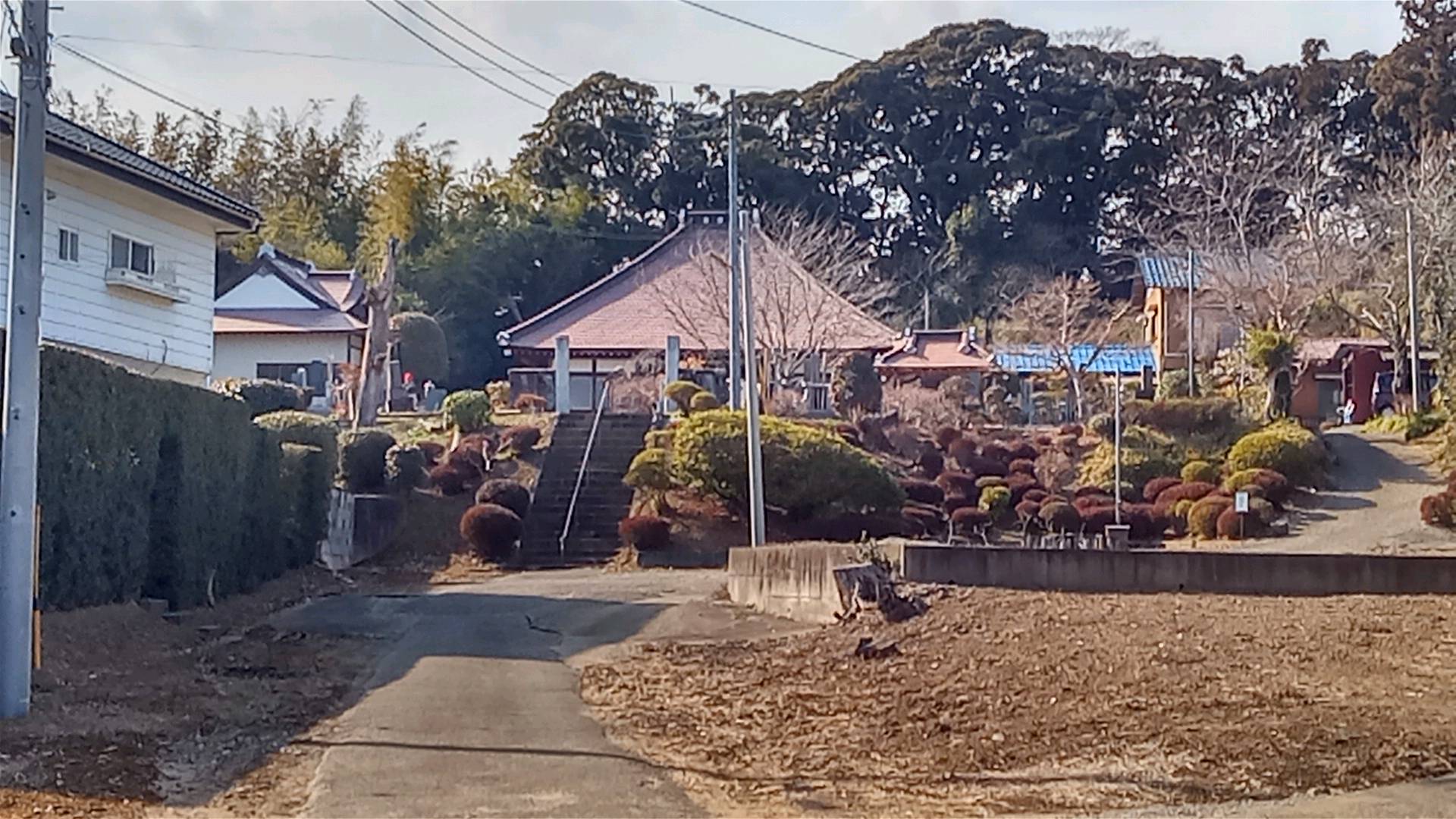 ずっと本埜村の最奥部を歩いてきて、押付薬師堂が見えた時にはほっとした。右が押付薬師堂、後方の高くなっている森の中腹に南陽院がある。