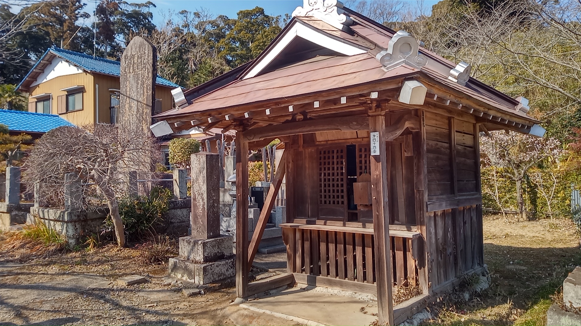 記念碑によると、本堂は平成に入ってから改修されたもので、墓地開発にあわせて行われたようだ。大師堂も、小さいながら近年になって改築されたもので、寄進者のお名前が記されている。