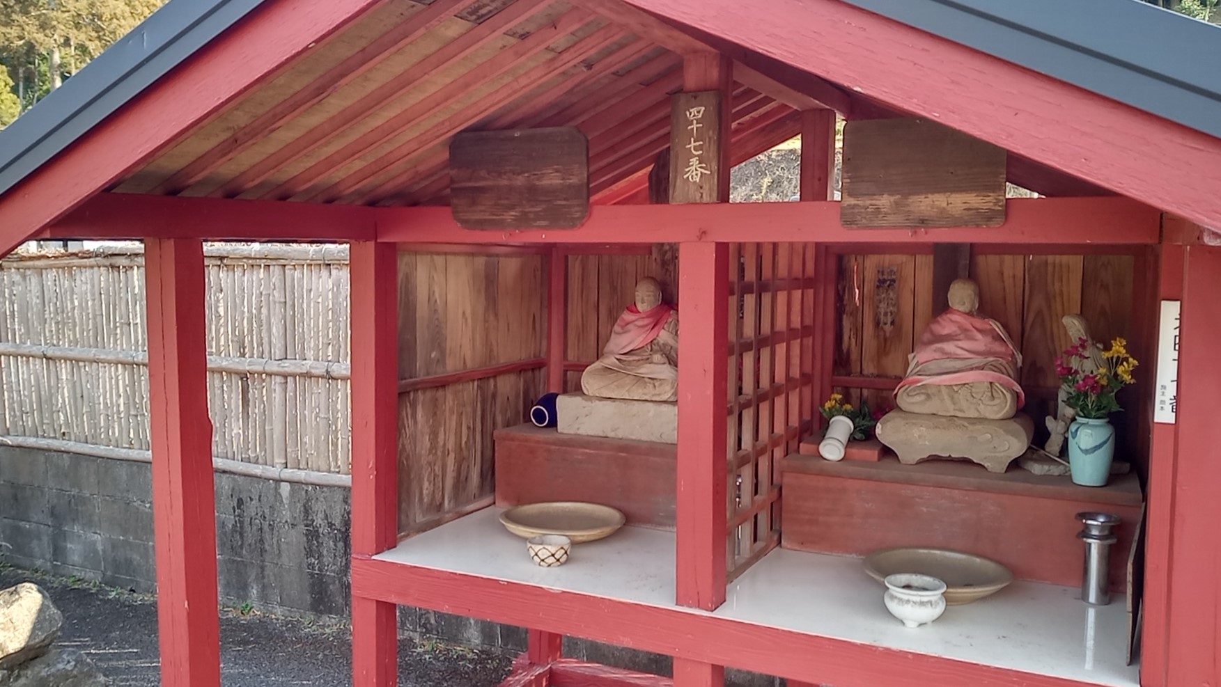 札所は本堂の左、墓地の前に置かれている。赤く塗ったお堂には2体のお大師様がいらっしゃって、格子はなく直にお顔を拝見できる。ご詠歌の額が2つ掲げられているが、残念ながら墨が薄くなって見えない。