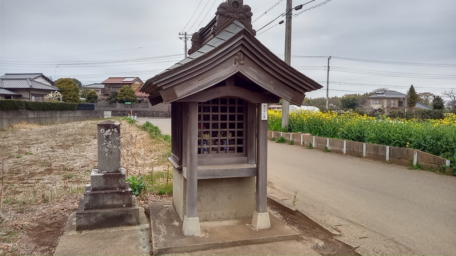 三十七番馬場の堂、平岡鳥見神社の近くで、隣に少年野球のグランドや集会所、共同墓地がある。後ろの畑には菜の花が満開。