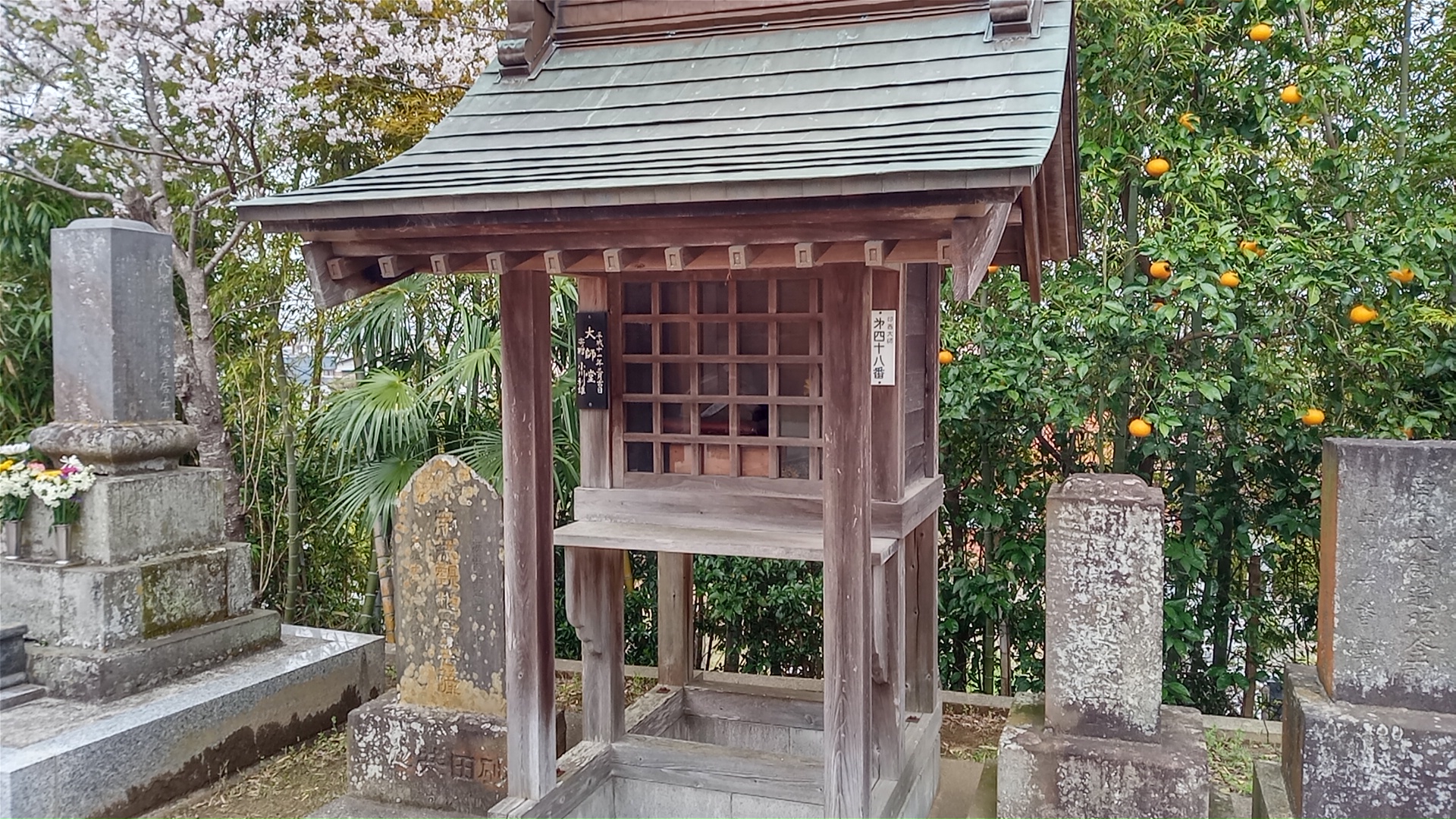 小さなお堂は、向かって左側に2つ建っている。そのひとつに、七十番の札所がある。傍らに「南無大師遍照金剛」の石碑、小堂には、お墓によくある石の香炉と花立てが備え付けてある。