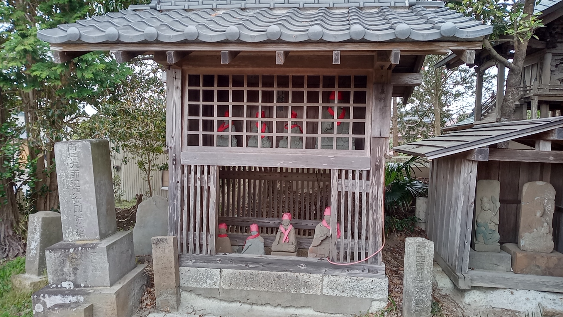 お堂も立派で、竜水院の札所など2段にわたりお大師様が4体ずつ、計8体いらっしゃる。他の札所の大師堂と比べてもずっと多い。そして、周囲には共同墓地、集会所、消防倉庫が揃っていて、ここが村落共同体の中心であったことが窺われた。