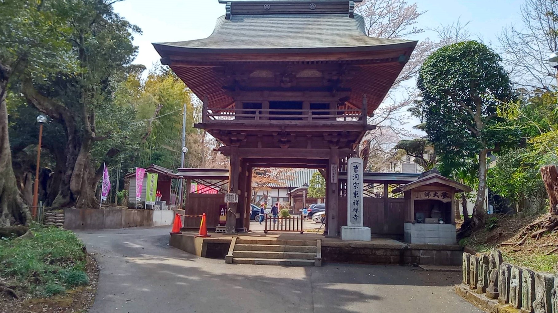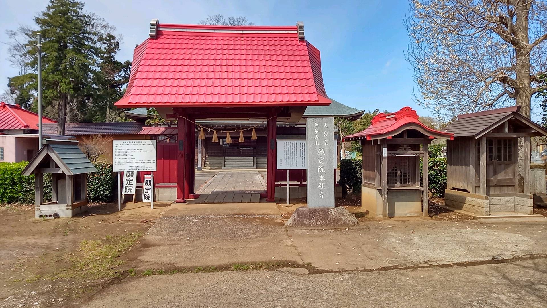 願定院の山門・本堂を斜めから。赤い屋根の山門の横が札所。写している手前側に馬頭観音堂がある。