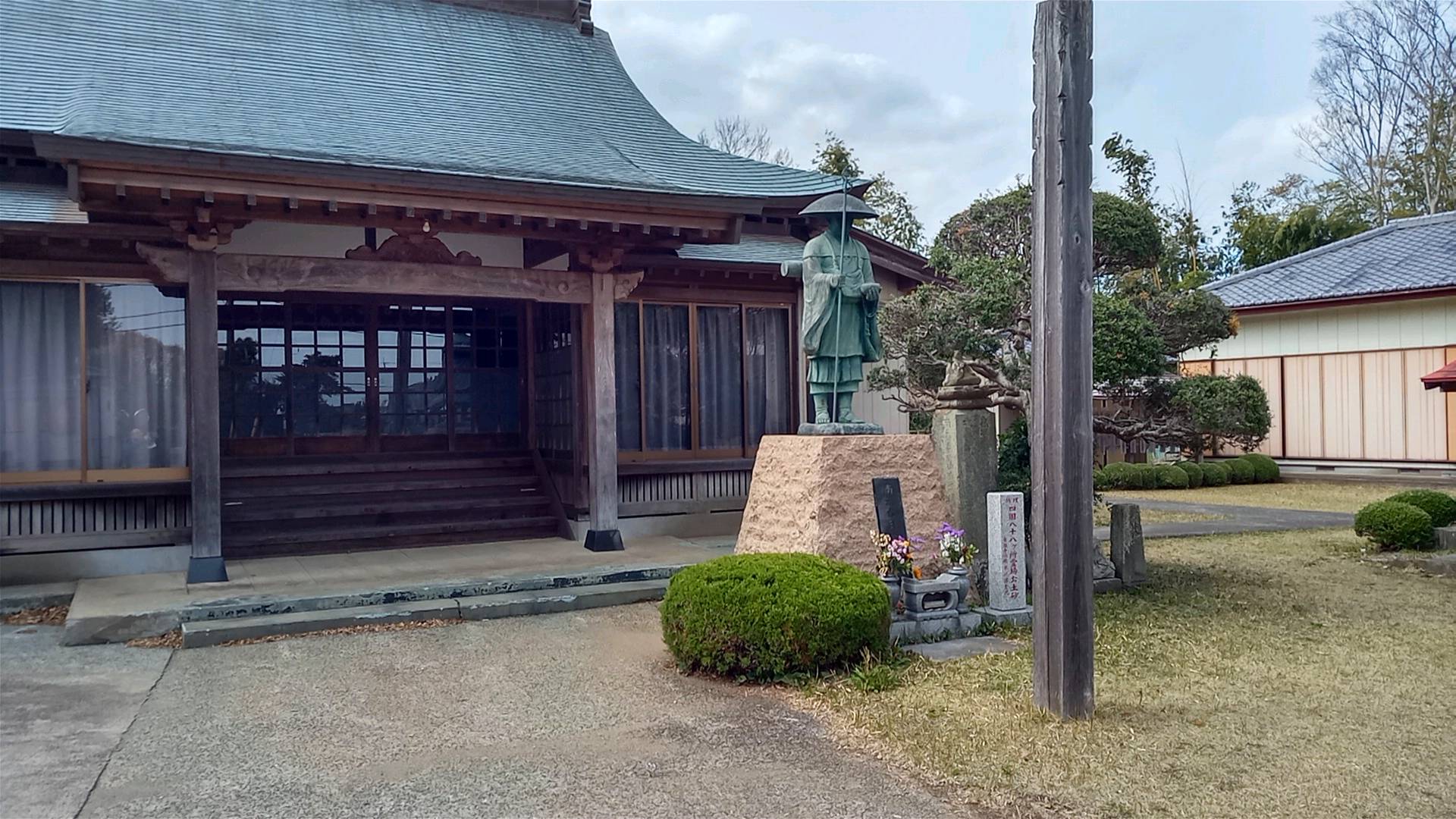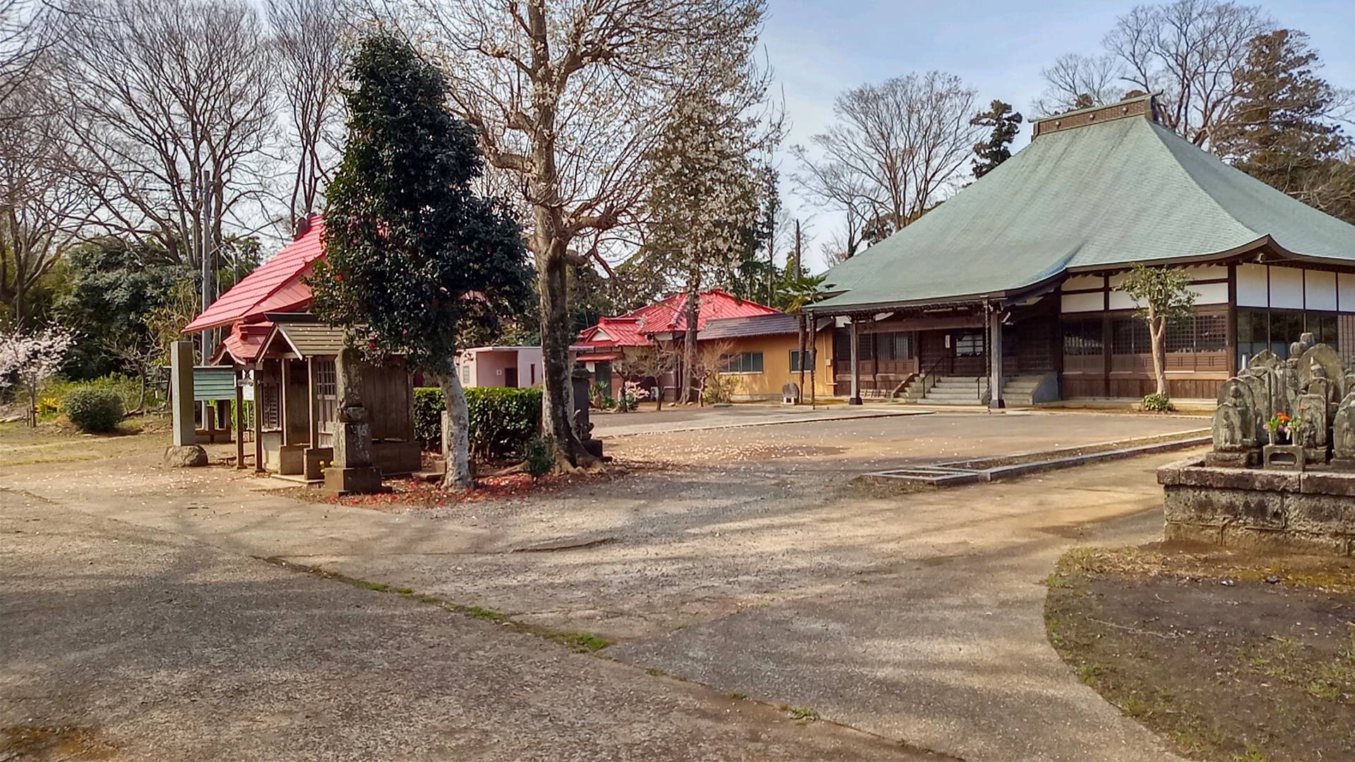 本堂はたいへん立派で、印西札所の中でも最大級の大きさである。道路に近い場所に七福神の福禄寿像と並んで、三十二番札所があり、横に集会所がある。本堂と離れているのは、お寺の所有地でないのだろうか。