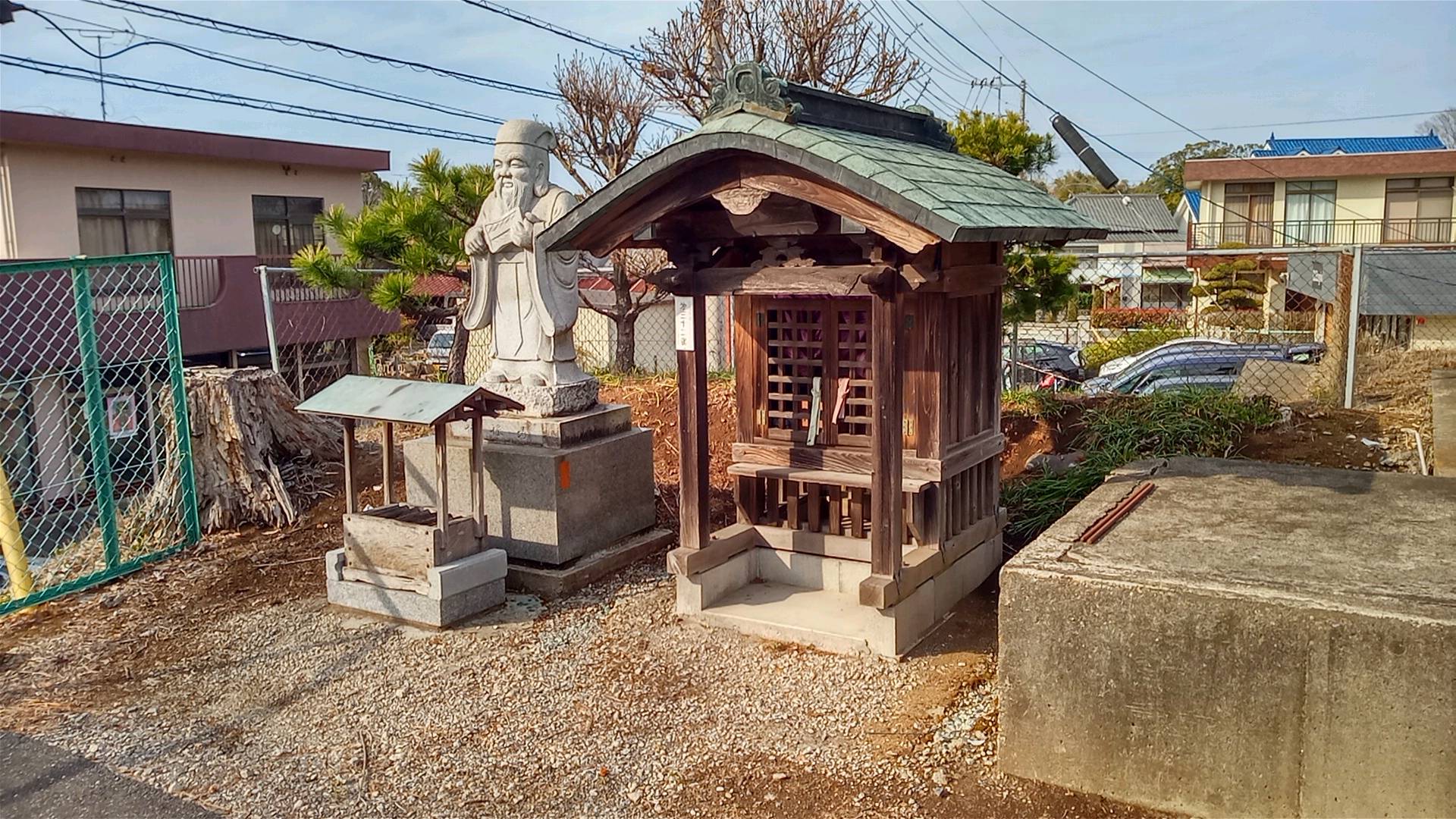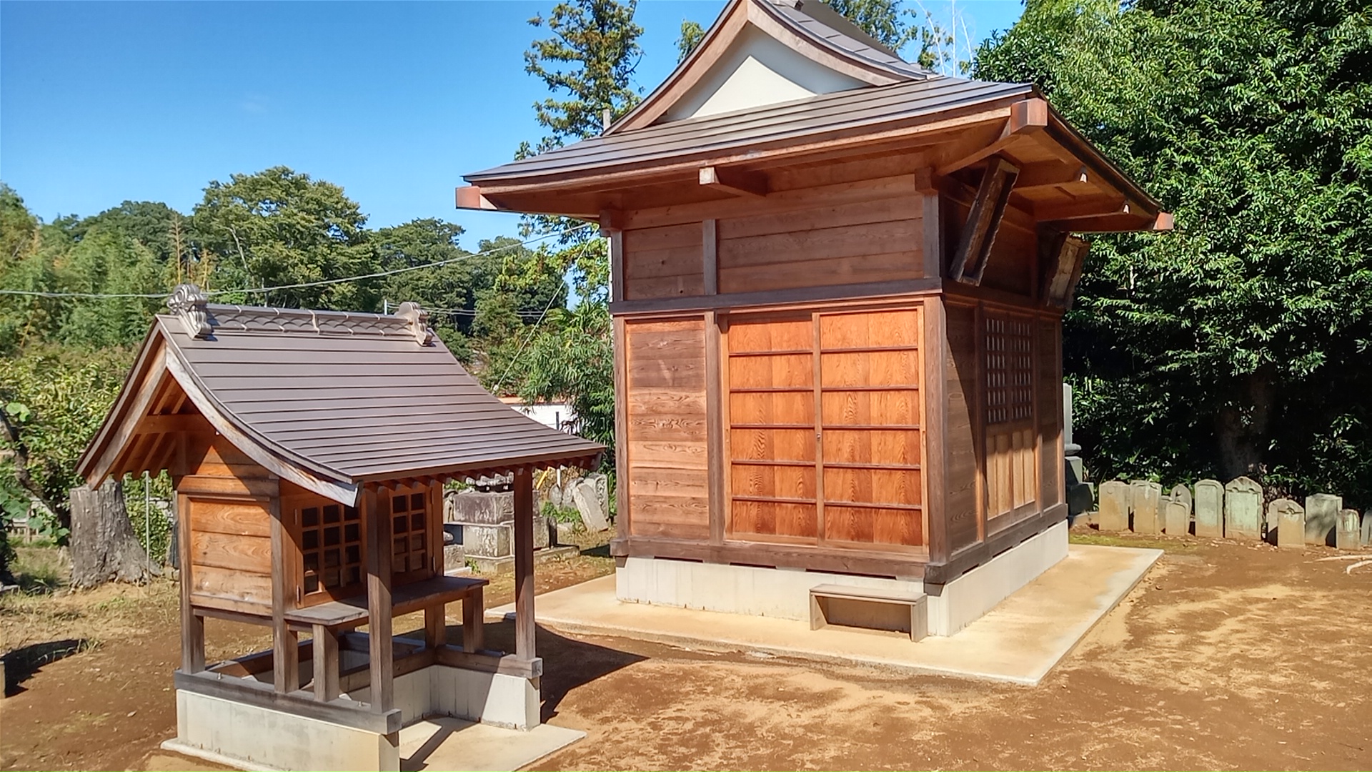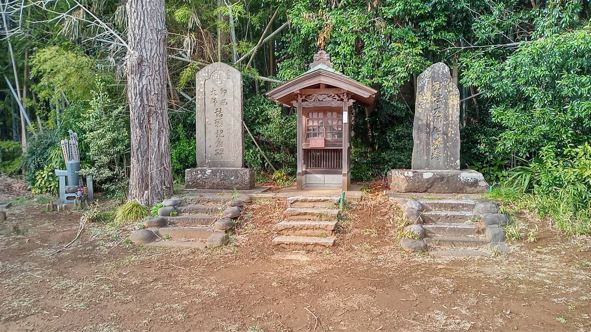 五差路から東に細い道を少し入ると、まさに至近距離に二つのお堂がある。五差路に近い方は中に入れる大きさのお堂と、印西大師によくある小堂である。いずれも近年になって建て替えられたものだが、周囲の様子は最近のものではない。