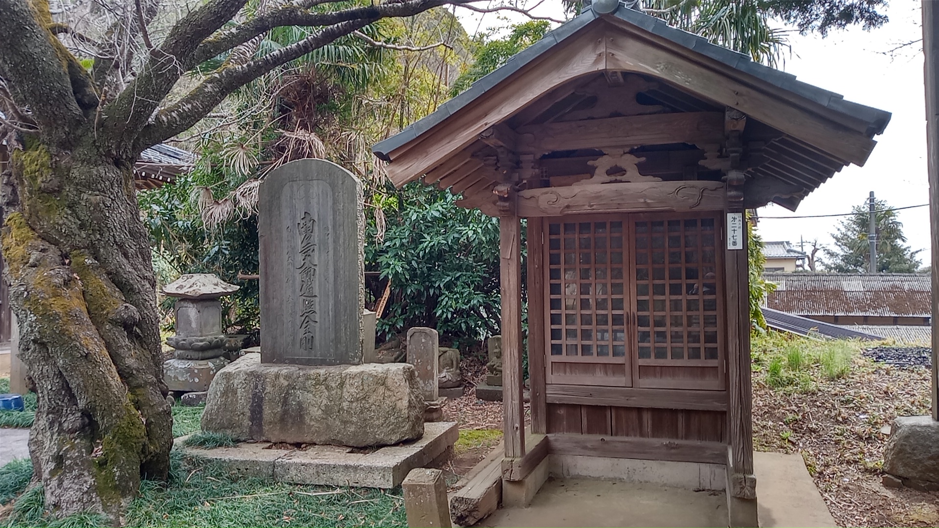観音堂の前に札所。十番切幡寺のご詠歌である。平成三年だから三十年前。少し薄くなりつつある。そして回向柱。こちらは墨が消えて読めないが、おそらく白井小廻大師のものだろう。
