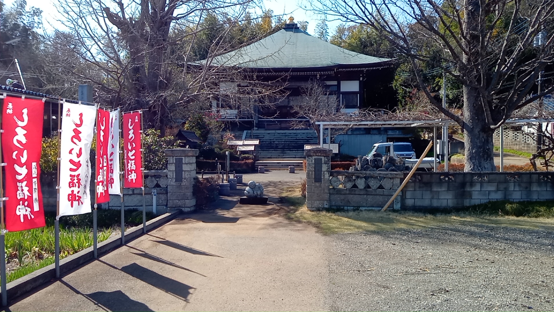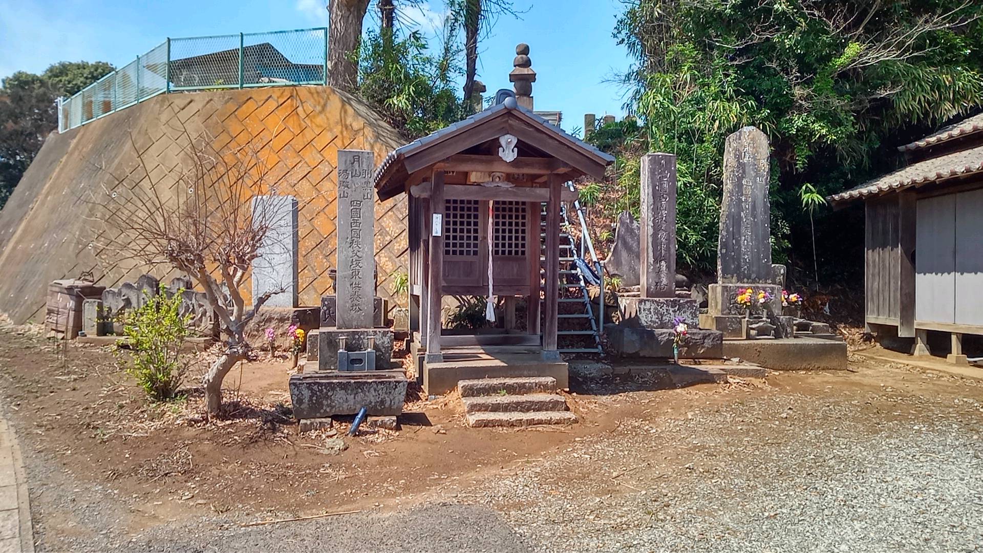 神宮寺札所。札所と向かい合って、白井大師講記念碑など過去の記念碑がいくつか並んでいる。