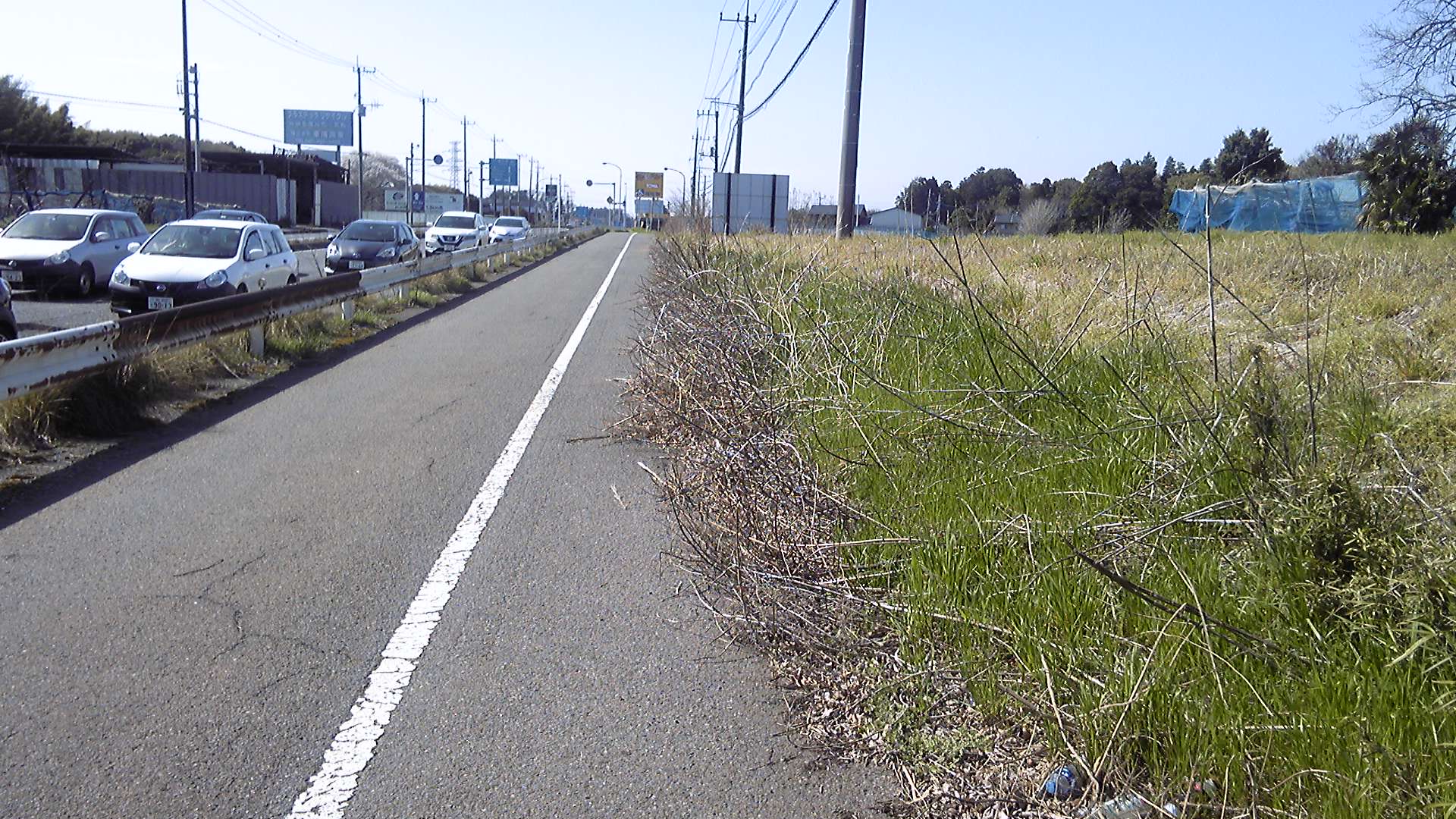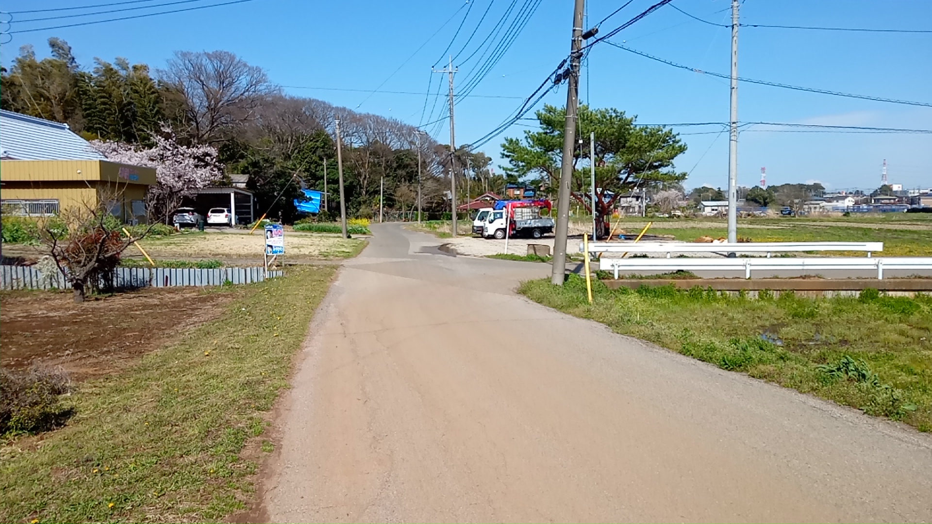 ここも、両側は林で、続いて産廃処理施設のような高い壁に囲まれた一画が現れる。向こうから大きなトラックがやってくる。道幅すれすれで、よける場所もない。そこを抜けて坂を下ると、畑と何軒かの農家となった。