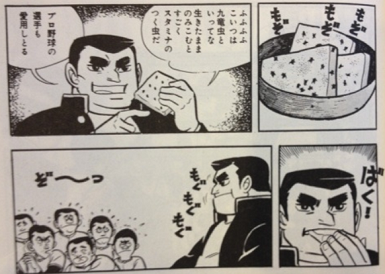 この虫が長く記憶に残った大きな要因が、「巨人の星」に出たことである。応援団長時代の伴宙太が、ひよわな野球部員に活を入れるため、自宅に呼んで強精料理を無理やり振舞うのだが、その中に九龍虫がいたのである。