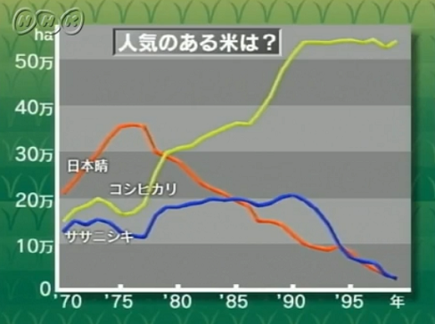 そして、コメ自体の味ではコシヒカリを好む消費者が多かったので、農家の作付けもコシヒカリやコシヒカリをもとに品種改良された銘柄(ひとめぼれ、あきたこまち、きらら397など)に移ってきた。下のグラフは2000年までのものだが、すでにコシヒカリとは大差がついている。
