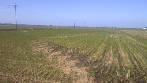 すでに9月中に刈り取りが終わった水田にも、まるで田植えの時期のように水が張られている。もちろん、水路から人為的に水を張っているのではなく、10日前の豪雨によって自然に水が溜まっているのだ。