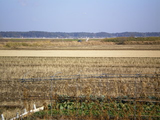印旛沼湖畔に出たところ。地平線沿いに、飛行機が見える。