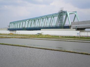 湖岸のサイクリングロードに沿って、南へ進む。500mばかり行ったあたりが渡河地点らしく、新しい橋の骨組みが作ってあり、そこからこちら(印旛村)側に、やはり田んぼを埋め立てて大規模な工事現場となっている。