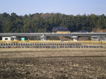その高台からは、田んぼを突っ切って前方の林まで道が伸びていたのだけれど、その道ごと高台が削られてしまった。下の写真をよく見ると、工事中の橋桁の向こうに高さ20mくらいの丘があって、こちら側にはわずかに残された土の塊がある。この両地点を結ぶ空間に、昨年の撮影スポットが存在したのである。