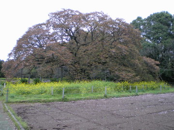 大雨が続き、天然記念物「吉高の大桜」も散ってしまいました。手前の畑に、花びらが見える。
