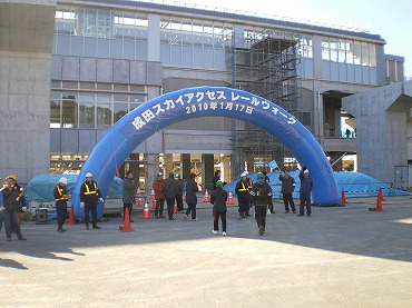 集合は午前9時、北総線・印旛日本医大駅前である。今回のレールウォーク、午前・午後の2回行われ、集合も日本医大組とJR成田組に分かれる。全部で400名なので、それぞれの組は100名ずつ。受付時間に印旛日本医大に着くと、もうレールウォーク参加者が集まっていた。