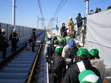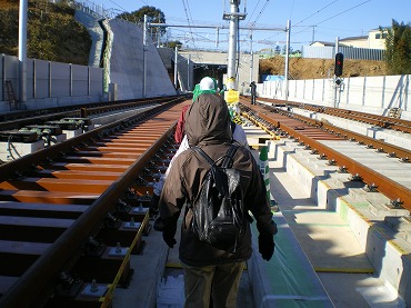 先行グループの進み具合により、時々ストップする。報道関係の人も結構いて、参加者にインタビューしたりしている。ところどころでヘルメットをかぶった工事関係の方が説明してくれる。この線路は新幹線規格で、レールは溶接で継ぎ目がないこと、枕木は現在では木ではなくコンクリだが、それでも枕木と呼ぶことなど、聞かなければ分からないことである。