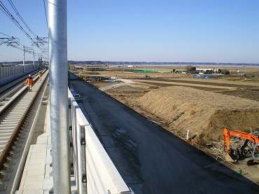 この、国道464号との交差地点から印旛沼捷水路までの工事区域は「吉高(よしたか)区間」というのだが、こうして山や丘を切り崩した結果、ほぼ上り下りのない、なだらかな曲線上を鉄道線路が走ることになった。以前は農家と田畑しかなかったあたりを鉄道線路の工事が進んでいる図は、結構シュールである。