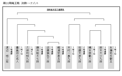 アメフトとの共通点は、Byeの仕組みがあることと、シード順位が上の棋士がよりシード順の低い棋士と当たることである。まずByeのシステムだが、以下のようになっている。
