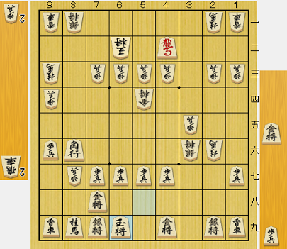 第1局は矢倉戦。お互いに馬を作って長期戦になりそうだったが、取られそうな2七桂を3五にハネたタダ捨てで、一気に形勢が傾いた。4四に銀が逃げると4六金で馬が追いつめられる。