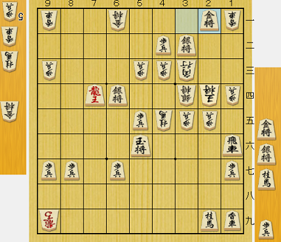AIの推奨は金で取る手で、以下後手は銀を逃げ、先手は竜を敵陣に侵入させてまだ長い勝負ながら、評価値的には60%:40%で先手に振れていた。玉で取った結果、△6四桂▲6五玉△7三歩と進み、入玉と竜の侵入を両方防がれてしまった。