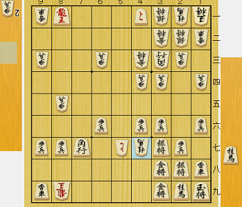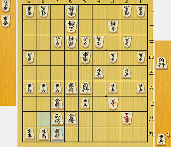 そして下図となる。ここまで攻撃の陣形は双方ほぼ変わらないのに、守備は先手が8八に玉を囲っているのに対し、後手はまだ3一にいる。玉を2二に入れるには単純計算で2手必要だが、その場合角は1三に動かさなければならず窮屈だ。