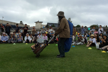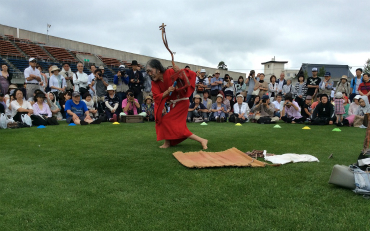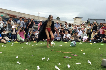 曇り空の函館千代台陸上競技場に、ギリヤーク師登場。「やっぱり函館は暖かいね」