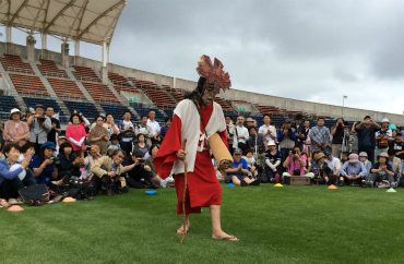 それにしても、トラックのど真ん中、メインとなる場所である。しかも、芝生は見事に整っている。こんな場所で公演をさせてもらえるとは、さすが師匠の故郷である。