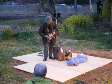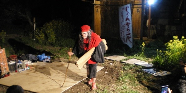 午後6時前、控え部屋を通ってギリヤーク師登場。舞台となったアトリエ前の畑にはベニヤ板が敷かれているが、そこまでの地面にでこぼこがあってカートがなかなか進まない。それと、例のバケツ(水をかぶるやつ)が置いてある場所をどこにするかで手間取って、開始は5分ほどずれ込んだ。観衆は50~60人くらい。常連の方はみたところ5~6人で、他は人形劇関係者である。