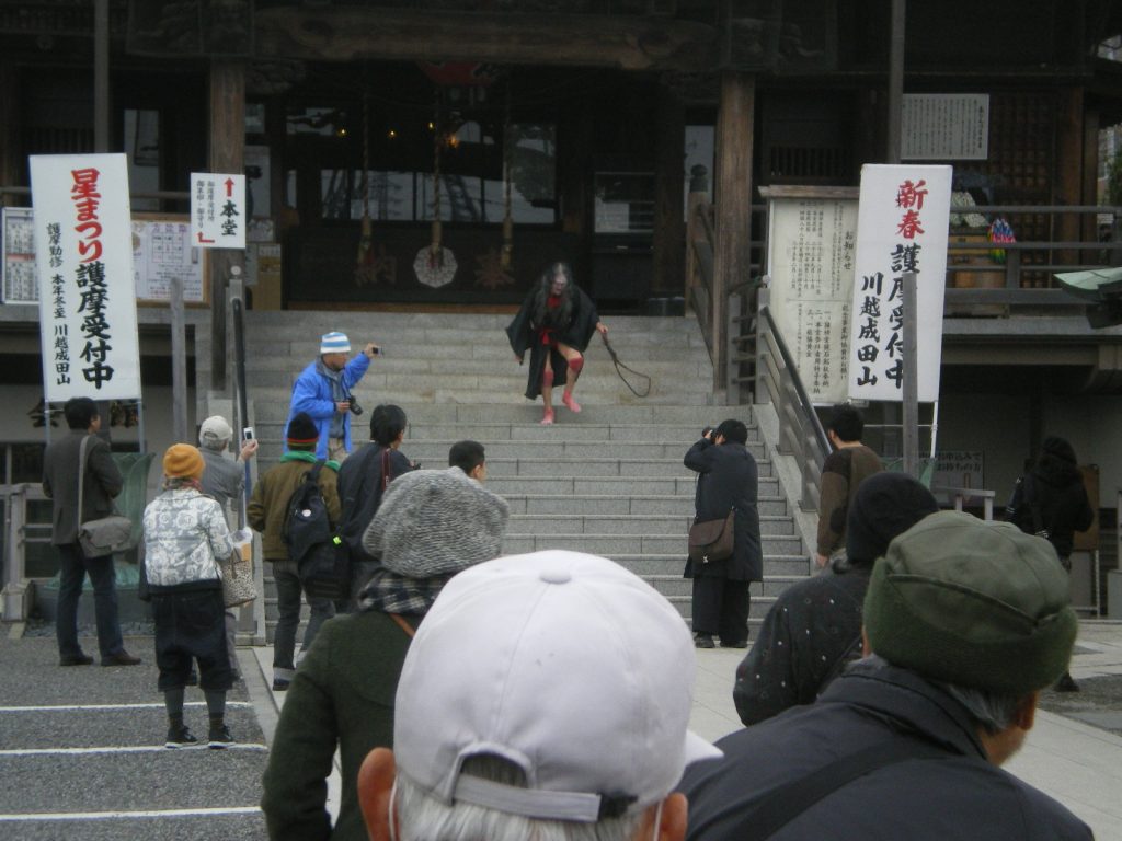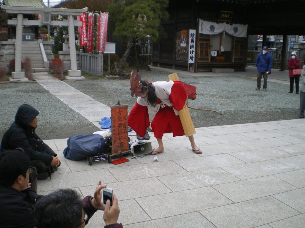 ただ、緊張したためか数珠を手繰る動きが今一つうまく行かず、ぶん回すのを多めにやっていた。クライマックスではそれまでの動きをカバーするためか、すごい勢いで本殿の階段を駆け上がっていき、踊り場で「南無阿弥陀仏」を熱唱、さらに数珠をぶん回す。そして手水鉢のところに置いてあったバケツを持ってきて、例によって頭からかぶってのた打ち回る。最後はきっちりまとめて、今年の締めを飾ったのであった。