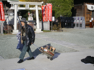 待つことしばし。観客はすでに50人ほど集まっている他、参拝する人達が不思議そうにパンフレット(例のコピーのやつ)を見ている。そして、いったん外に出てから、成田山川越別院の正門をくぐって入ってきた。例のカートを引いて、そして川越公演はいつもうれしそうなのである。この日は、例年にも増してうれしそうに見えた。