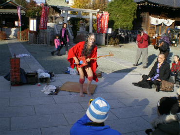 成田山が二時に鳴らす太鼓の音を背に、おもむろに準備にかかる。最初の頃は風があったのだがそれもおさまって、まずまずの好天。おそらく気温は10℃に達していないので寒いには違いないが、12月の川越でこれ以上を望むのは無理だろう。1曲目は「じょんがら一代」、エア三味線で踊る曲である。触れの声も元気。今日は期待できそうだ。